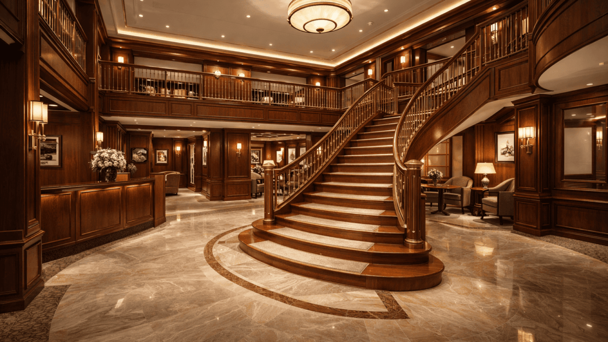 The concept of luxury is measured by the quality felt the moment one enters the space. Reception desks, custom-designed wooden staircases in lobby areas, and furniture in suite cabins come to life with first-class veneers. The warm texture of solid wood combines with brass details and lightweight panels resembling natural stone to create a unique atmosphere. Cita Marine craftsmen process every single wooden piece with millimetric precision in accordance with the ship’s overall concept.