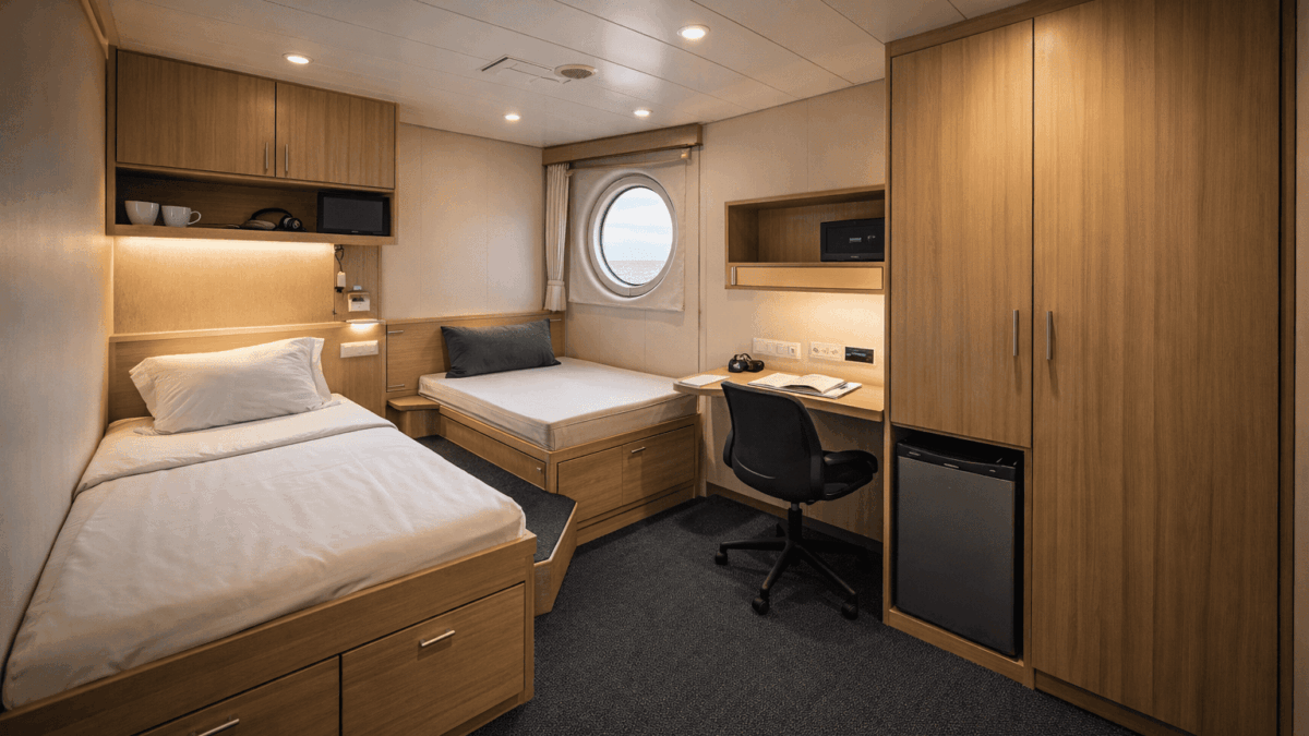 Proper rest for the crew during long sea missions is the foundation of operational safety. Orthopedic bed systems supporting the body structure, correctly positioned reading lights, and personal storage areas reduce the stress level of the personnel. Lighting and color choices facilitating focus transform cabins from just a sleeping area into a real living center.